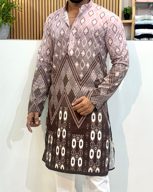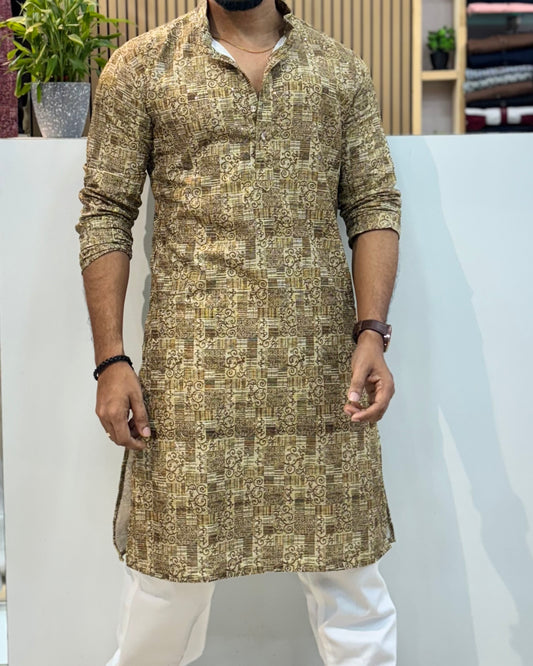 Geometric Motif Cotton Kurta With Crochet & Digital Print Brown