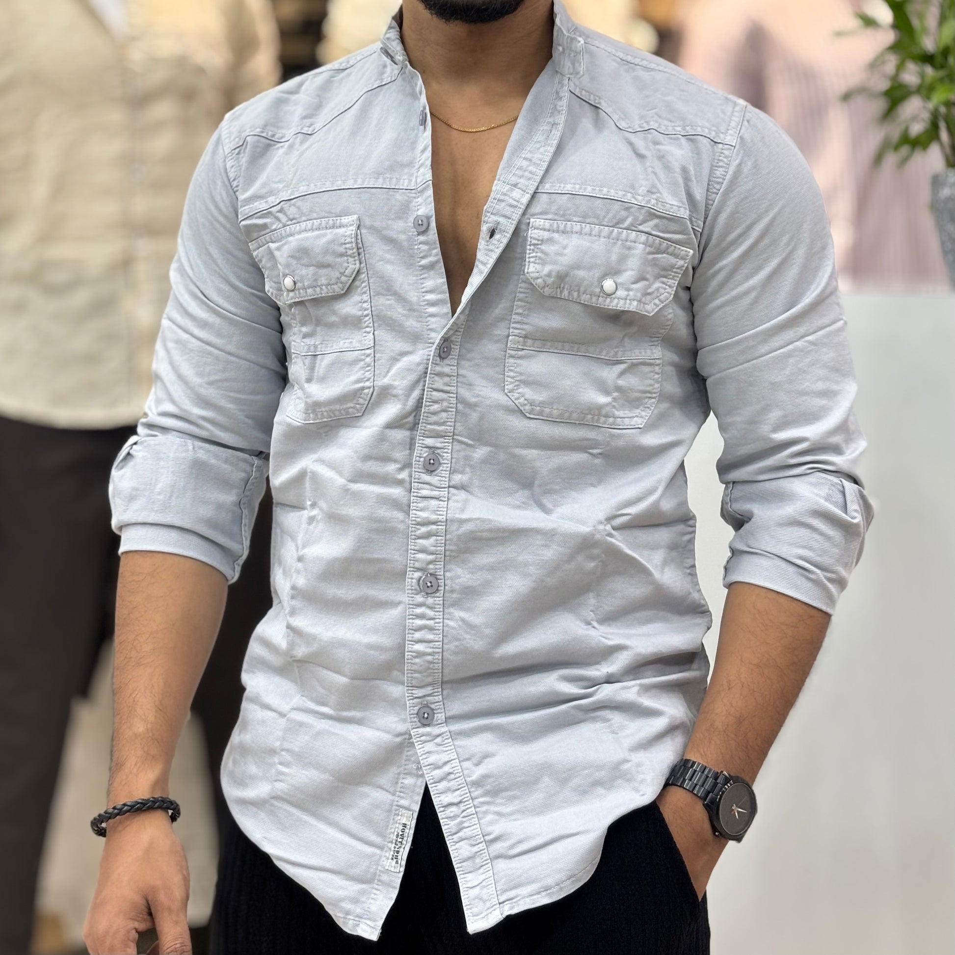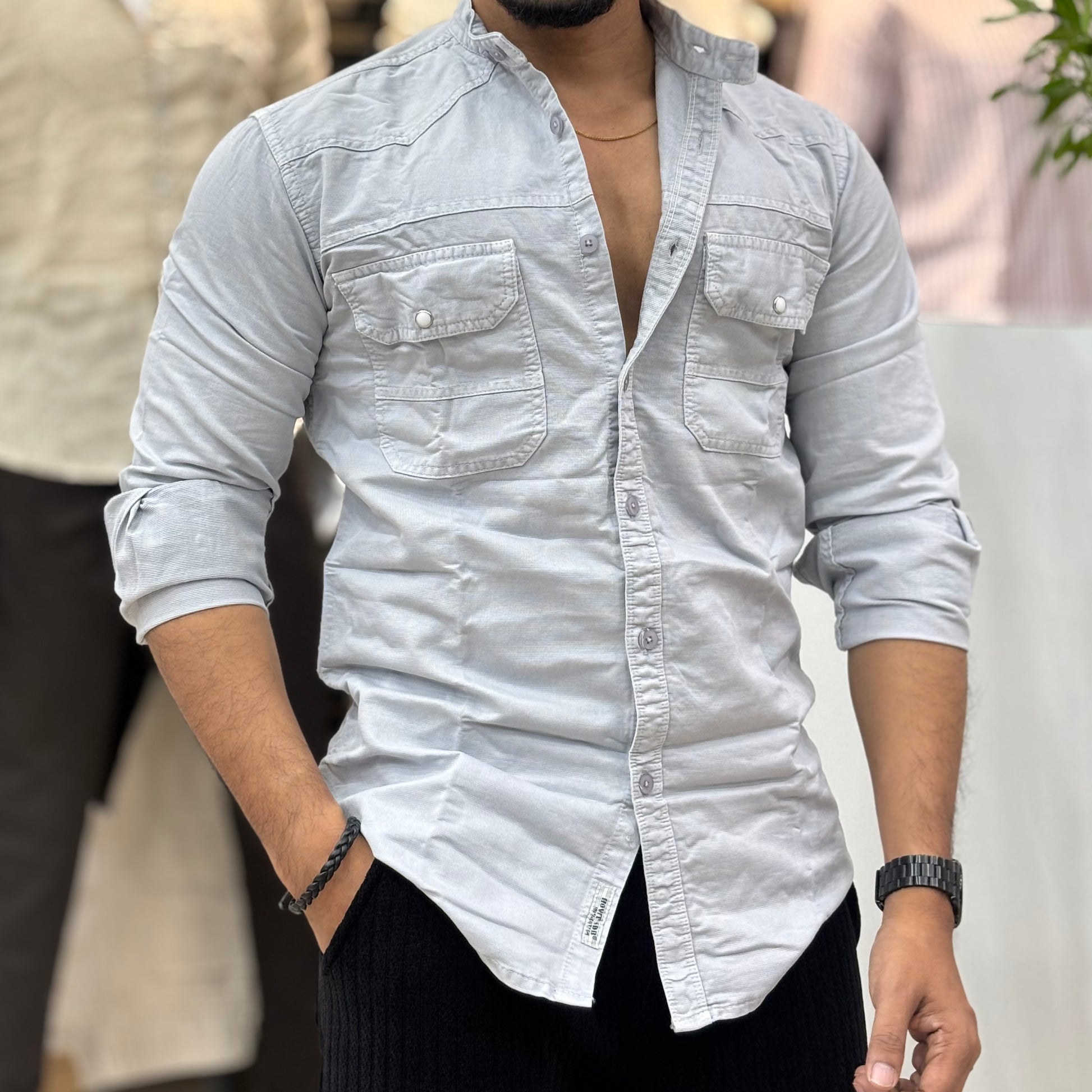 Rfd Mandarin collar double pocket shirt Regular Fit Casual Shirt. Meticulously designed to redefine your style, this shirt marries elevated fashion with utilitarian practicality. Crafted from premium RFD fabric boasting a higher weave, it reflects our unwavering commitment to quality and innovation