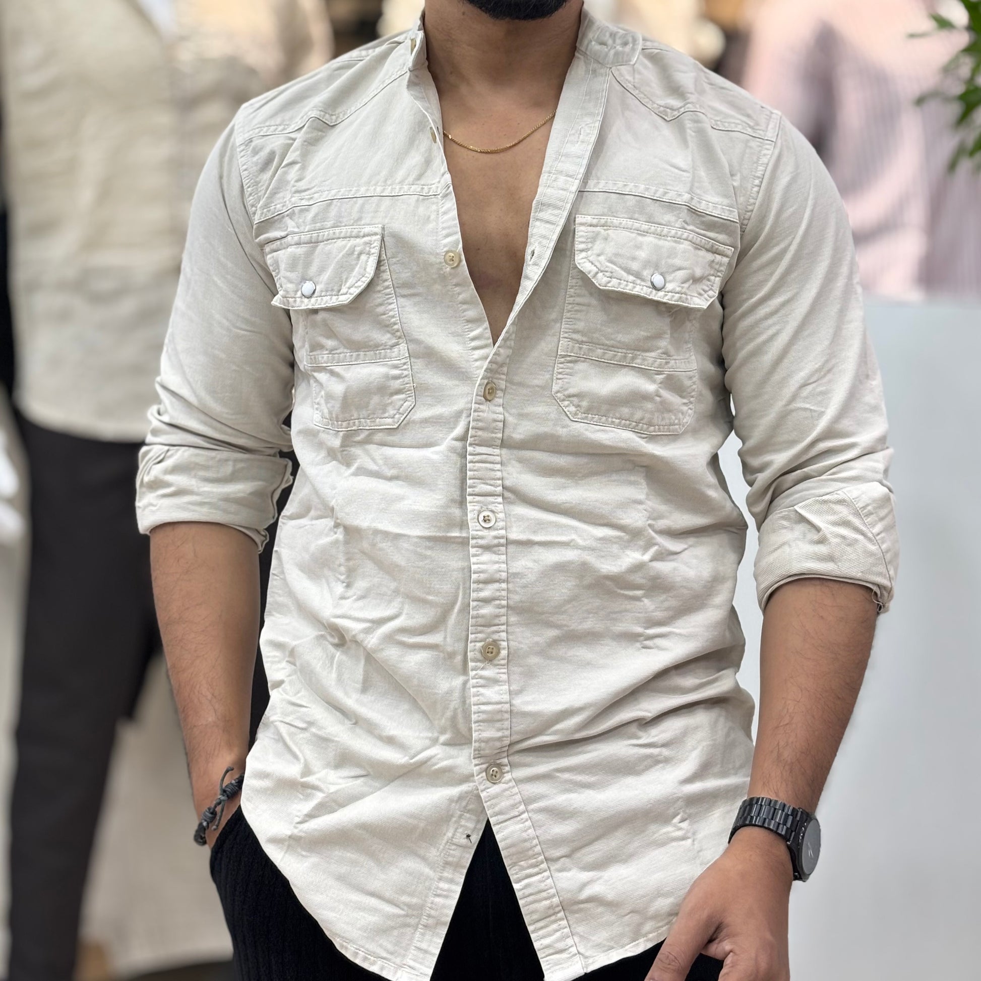 Rfd Mandarin collar double pocket shirt Regular Fit Casual Shirt. Meticulously designed to redefine your style, this shirt marries elevated fashion with utilitarian practicality. Crafted from premium RFD fabric boasting a higher weave, it reflects our unwavering commitment to quality and innovation